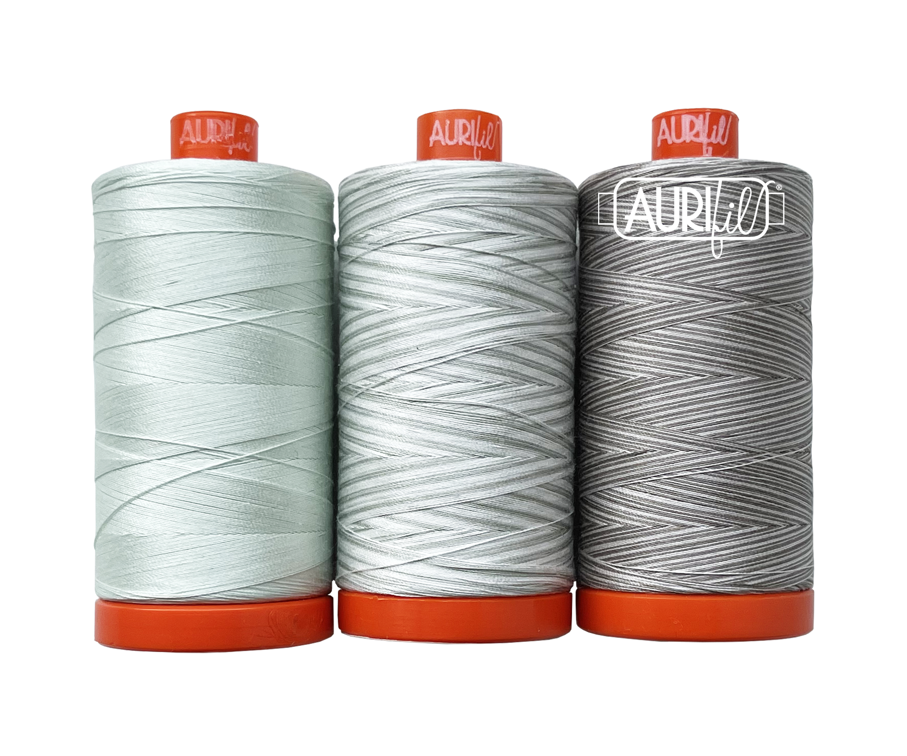 The Flora Color Builders are a capsule of 12 mini-collections created in celebration of Aurifil’s variegated thread; threads that contain multiple colors or multiple shades of one color. Each set contains 3 large spools of 50wt — 2 variegated and 1 complementary solid.