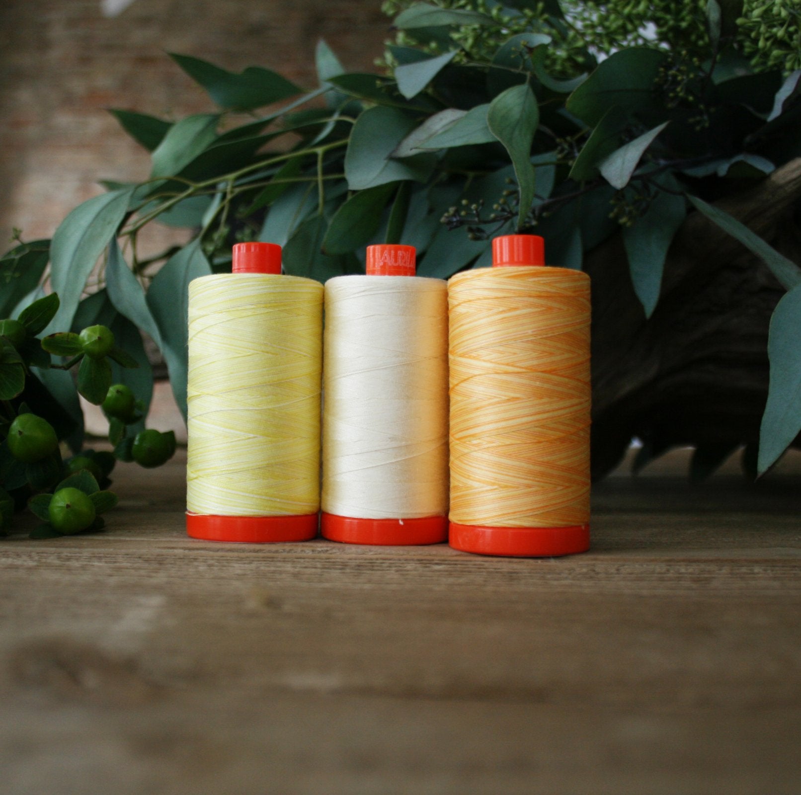 The Flora Color Builders are a capsule of 12 mini-collections created in celebration of Aurifil’s variegated thread; threads that contain multiple colors or multiple shades of one color. Each set contains 3 large spools of 50wt — 2 variegated and 1 complementary solid.