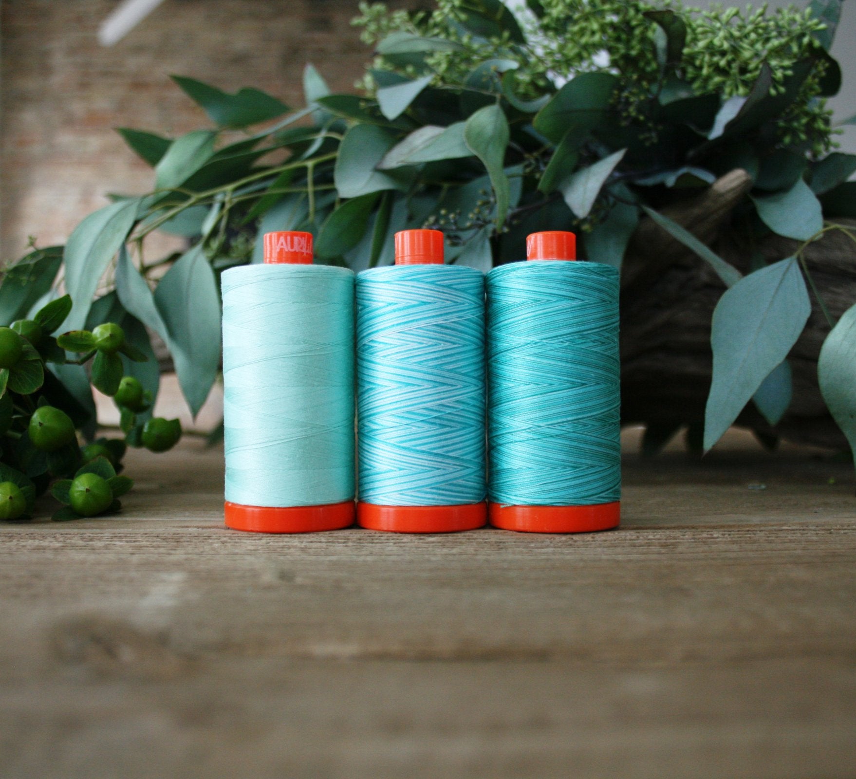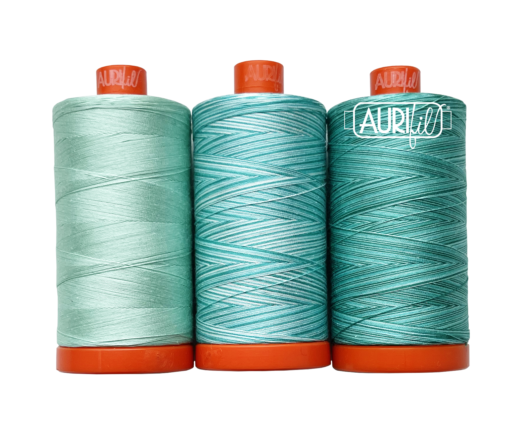 The Flora Color Builders are a capsule of 12 mini-collections created in celebration of Aurifil’s variegated thread; threads that contain multiple colors or multiple shades of one color. Each set contains 3 large spools of 50wt — 2 variegated and 1 complementary solid.