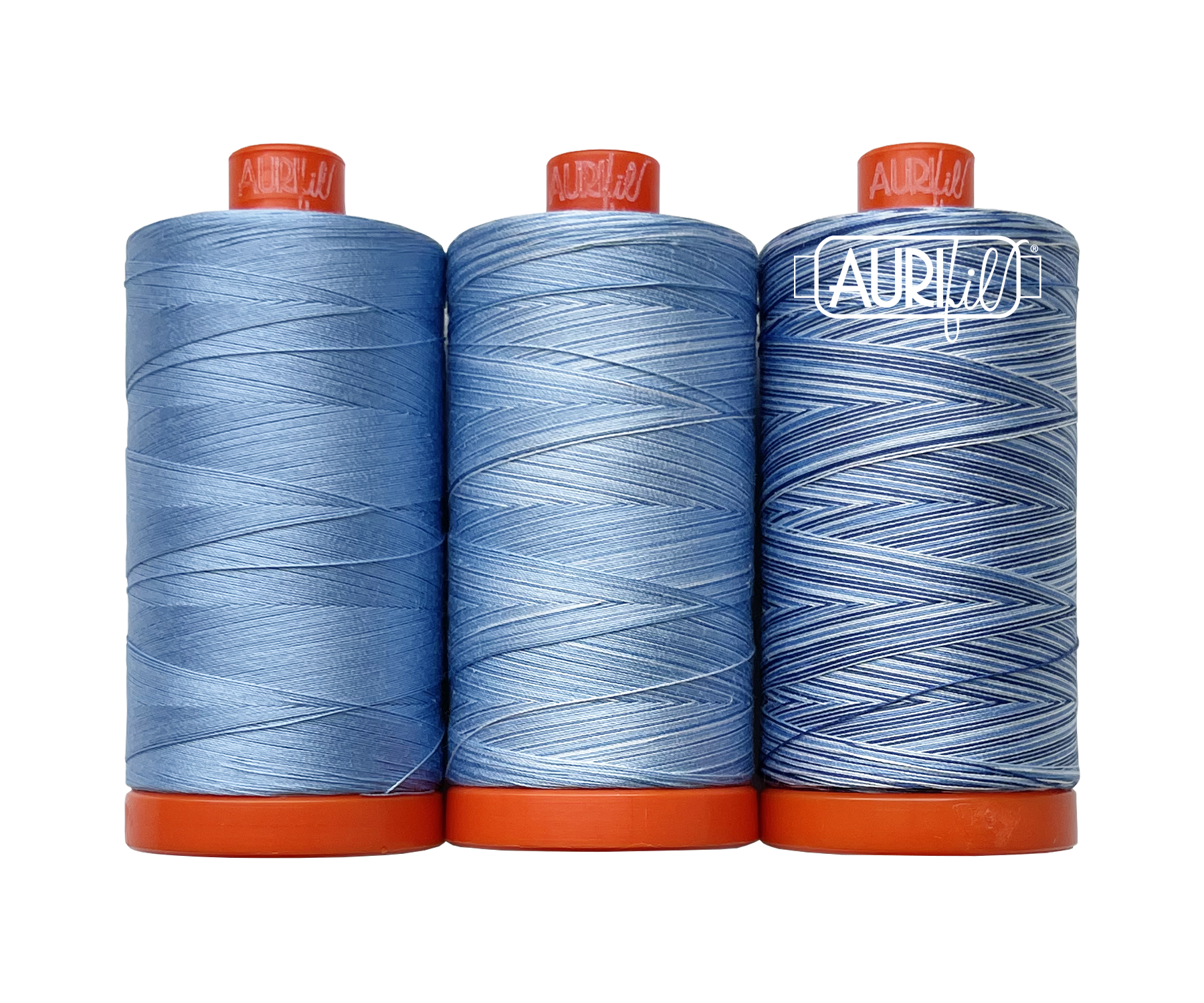 The Flora Color Builders are a capsule of 12 mini-collections created in celebration of Aurifil’s variegated thread; threads that contain multiple colors or multiple shades of one color. Each set contains 3 large spools of 50wt — 2 variegated and 1 complementary solid.