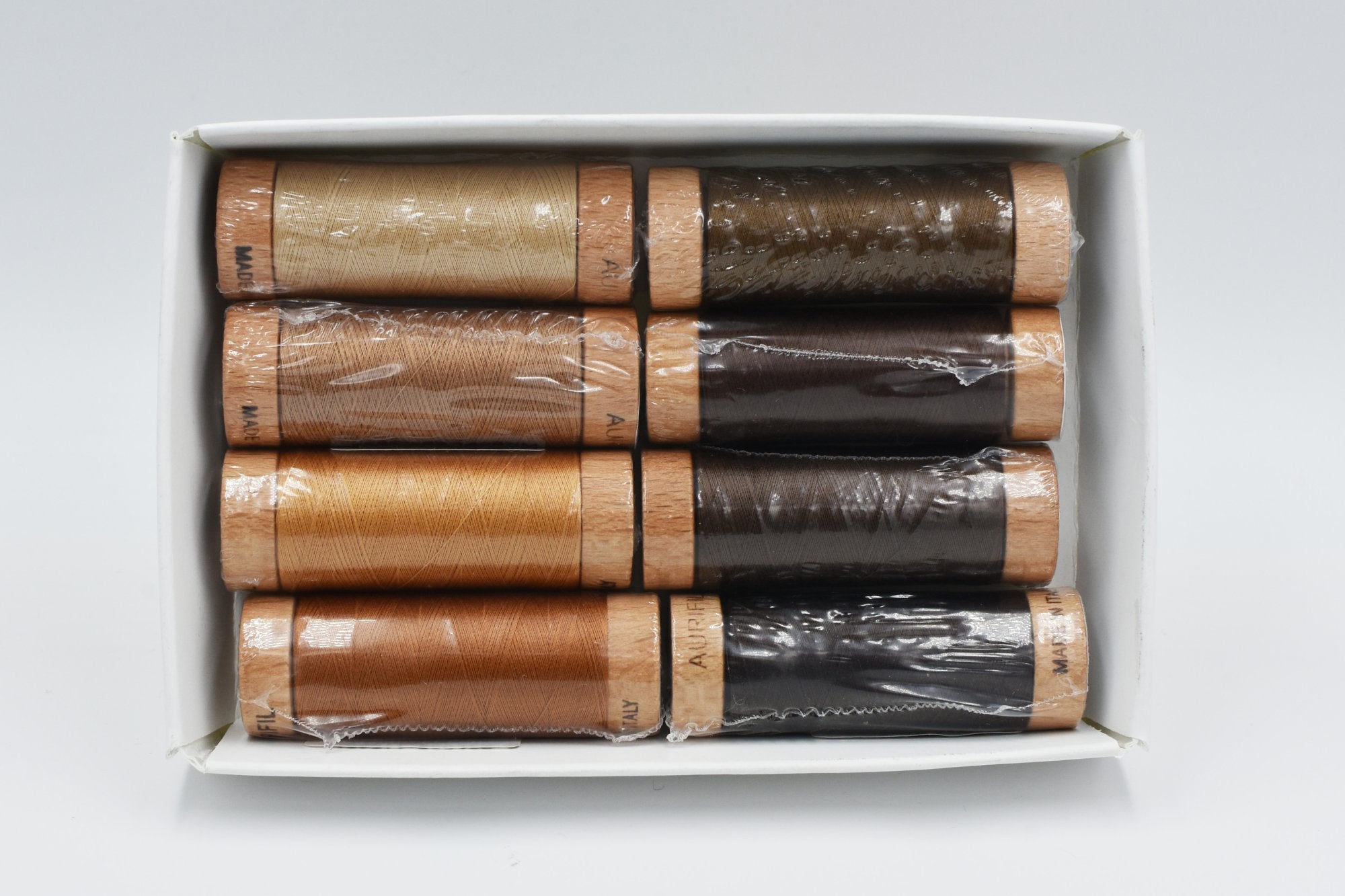 8 x Small Spools (280m) of Aurifil 80wt thread, packaged in a handy box for easy storage.