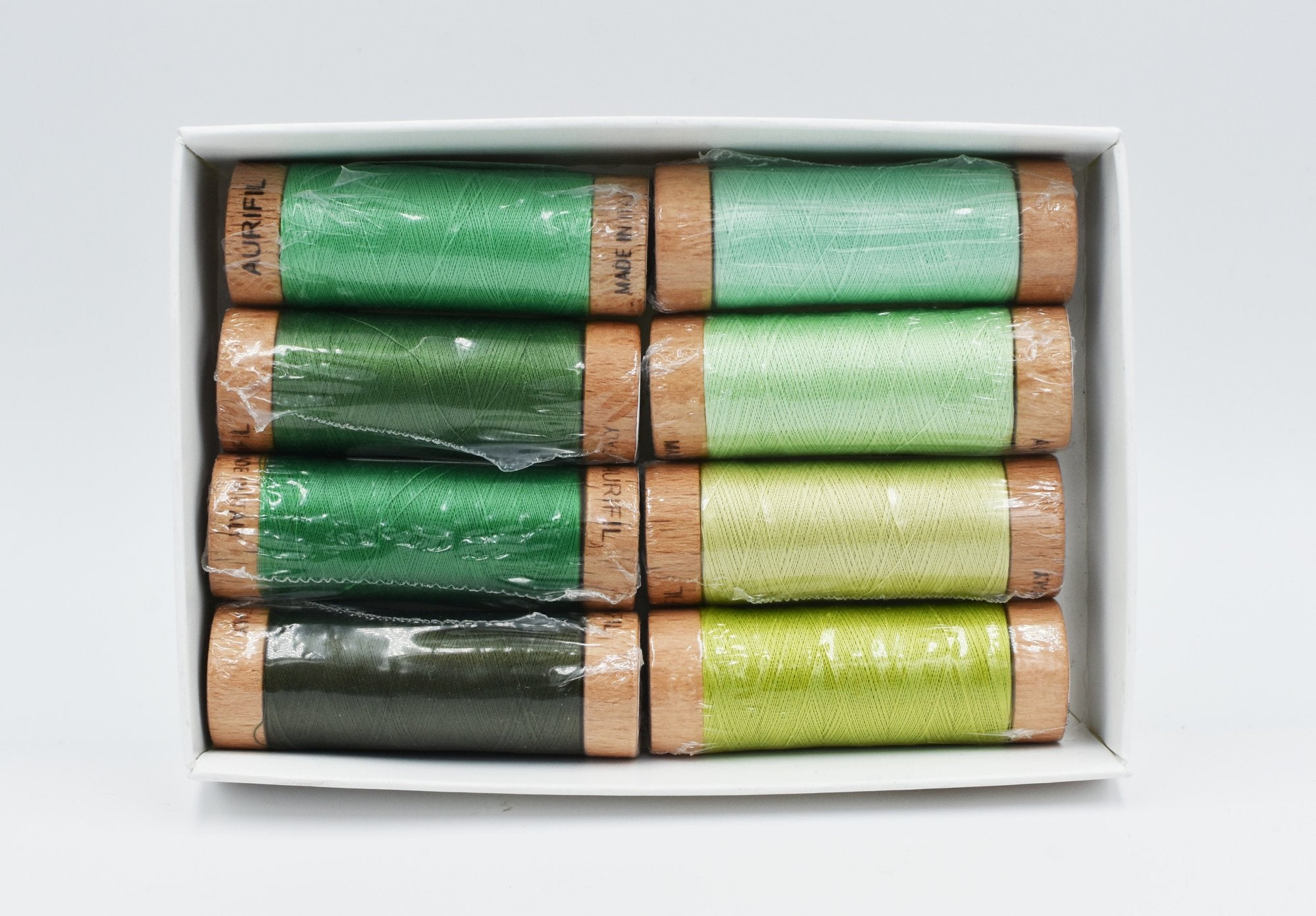 8 x Small Spools (280m) of Aurifil 80wt thread, packaged in a handy box for easy storage.