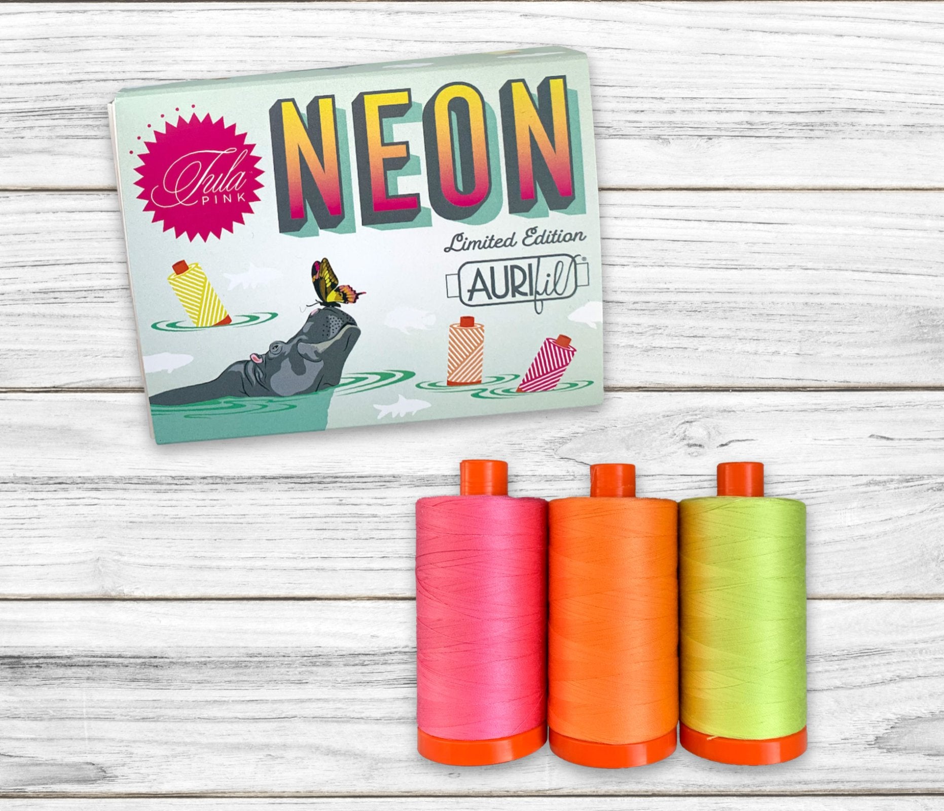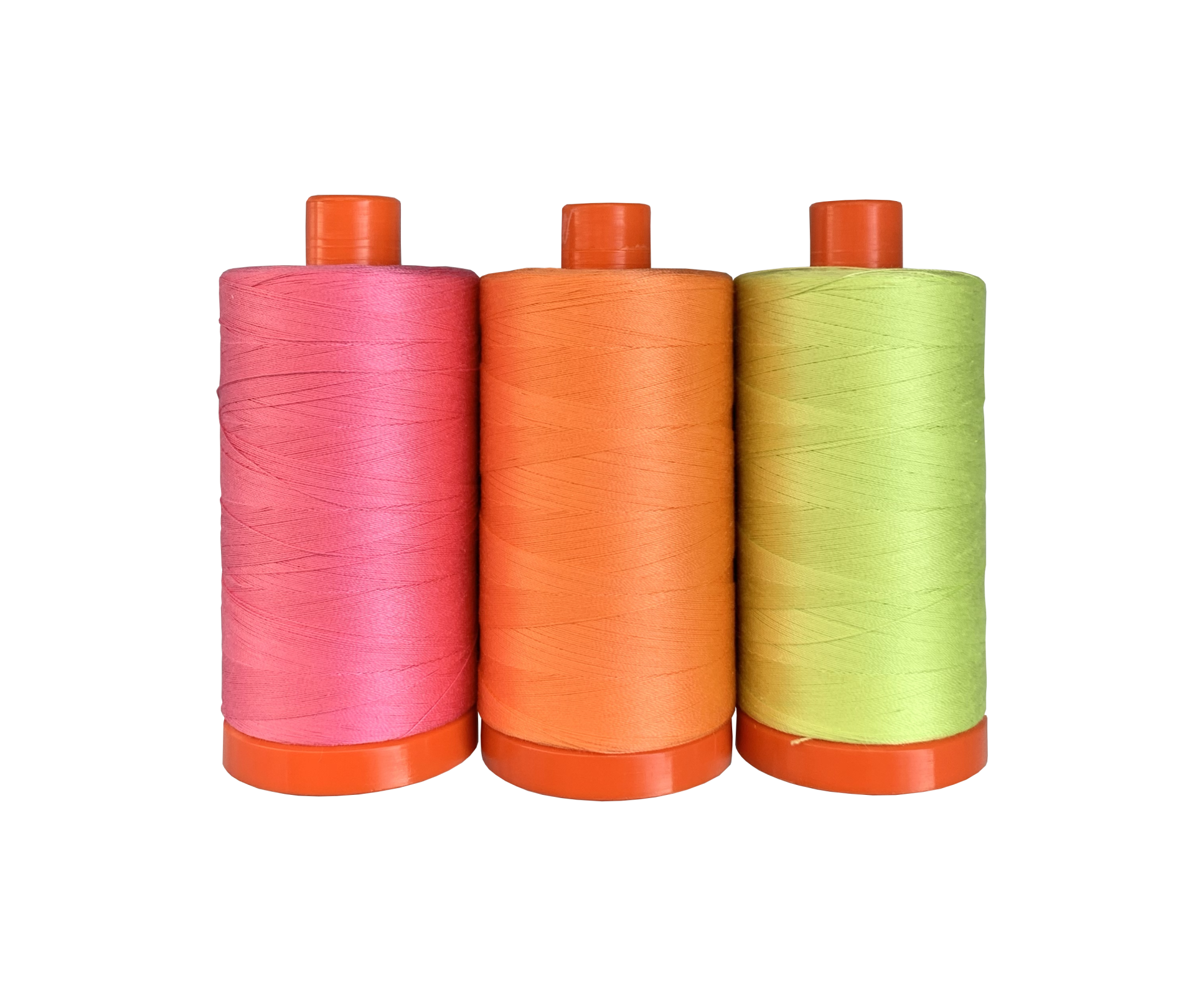 The coordinating collection features a stunning range of hues in Aurifil’s versatile 50wt thread, including 3 custom NEON colors.