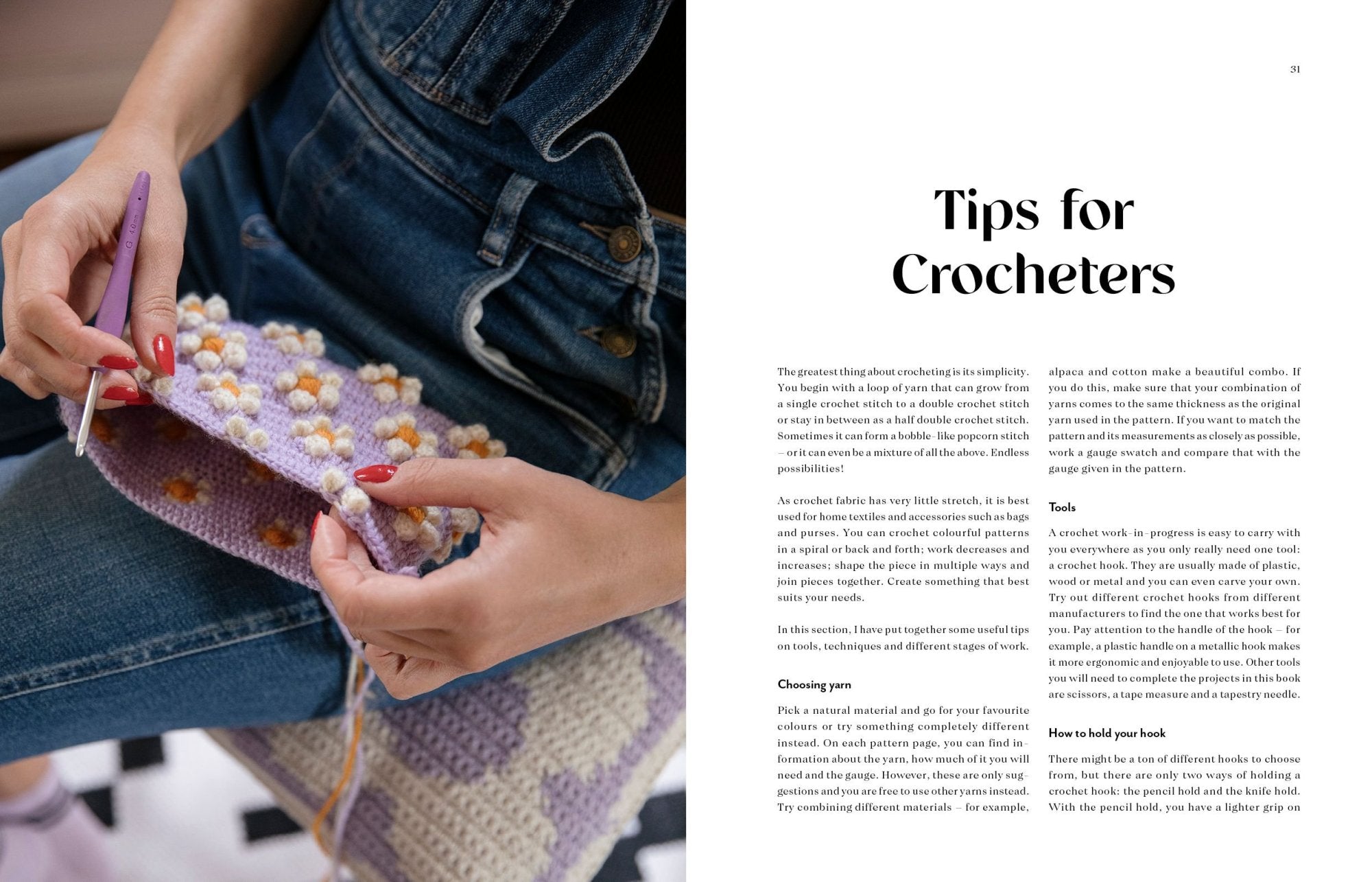 Crochet's compact and sturdy fabric is best suited for wear-intensive things such as carpets and bags. This book is a collection, so you can combine patterns and vary the colours to your liking.