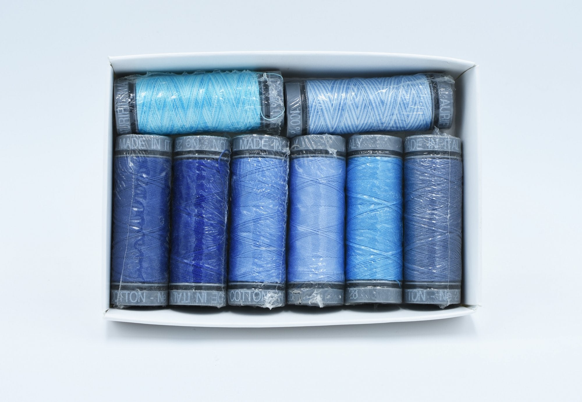 8 x Small Spools (100m) of Aurifil 28wt thread in a cohesive range of blues, packaged in a handy box for easy storage.