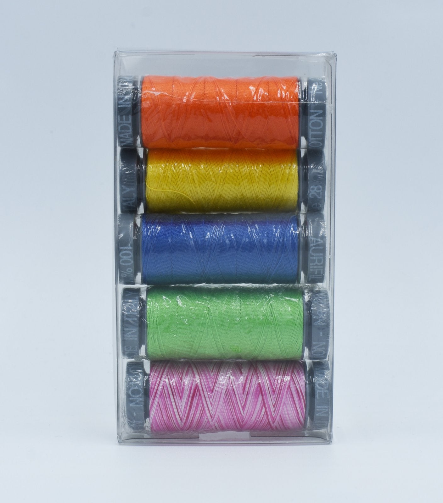 5 x Small Spools (100m) of Aurifil 28wt thread in a cohesive range of brights, packaged in a handy box for easy storage.