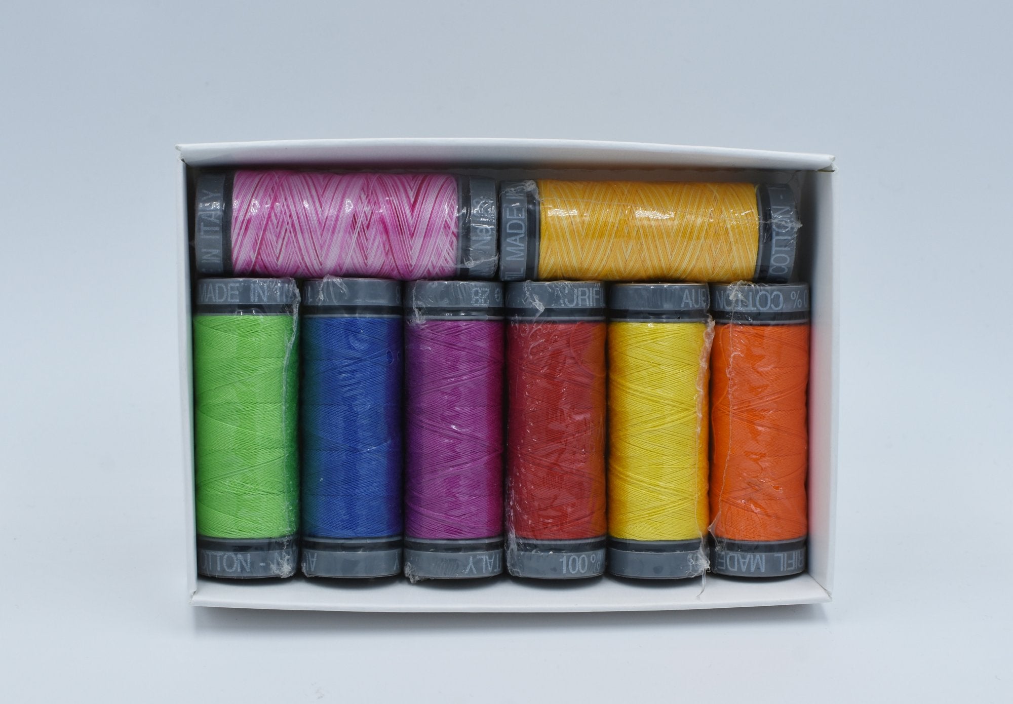 8 x Small Spools (100m) of Aurifil 28wt thread in a cohesive range of brights, packaged in a handy box for easy storage.