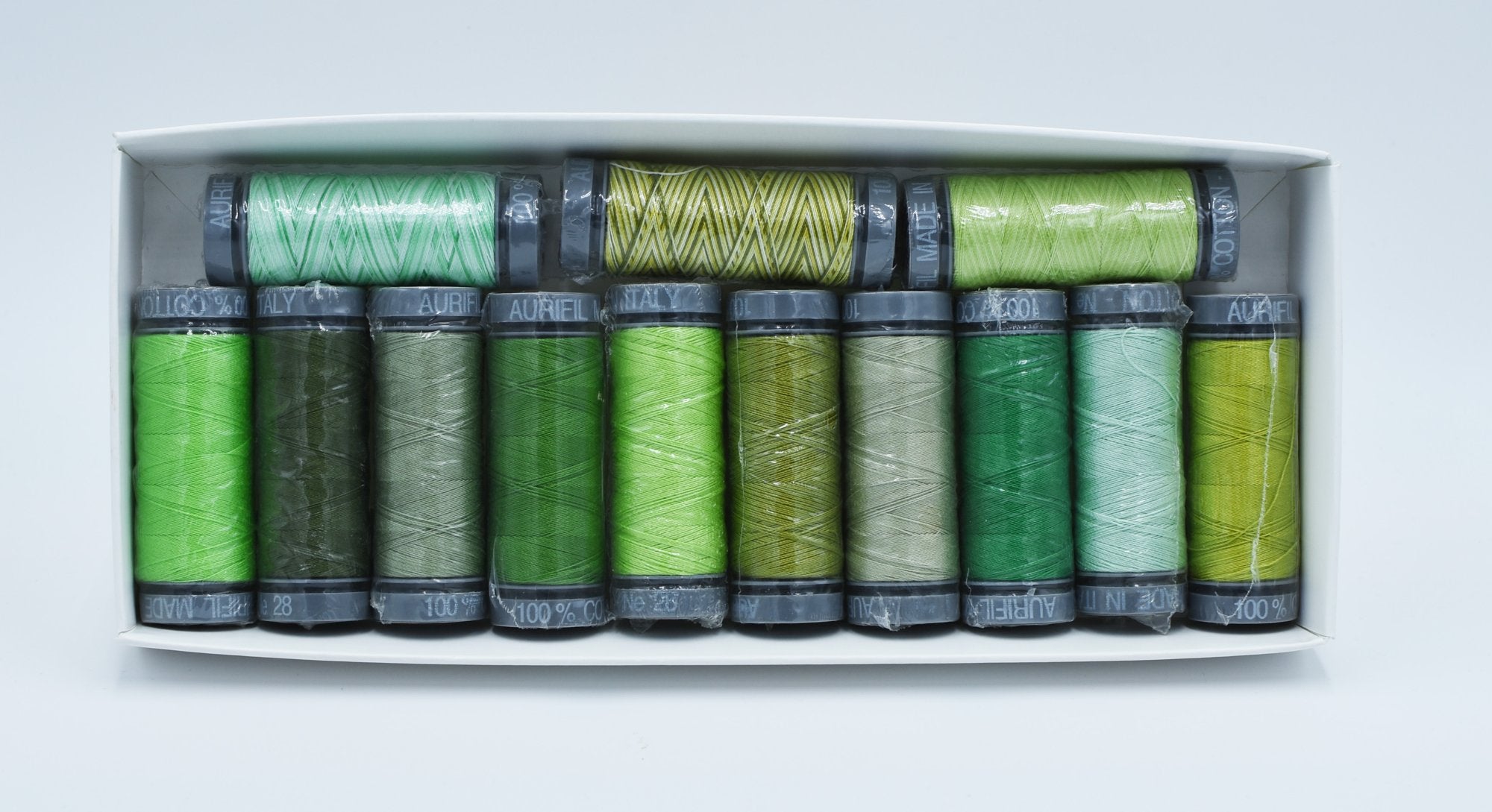 13 x Small Spools (100m) of Aurifil 28wt thread in a cohesive range of greens, packaged in a handy box for easy storage.