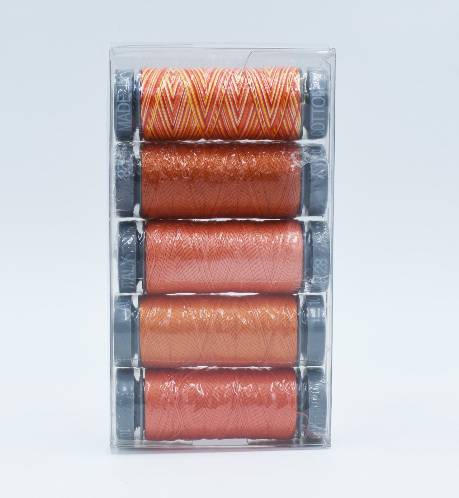 5 x Small Spools (100m) of Aurifil 28wt thread in a cohesive range of oranges, packaged in a handy box for easy storage.