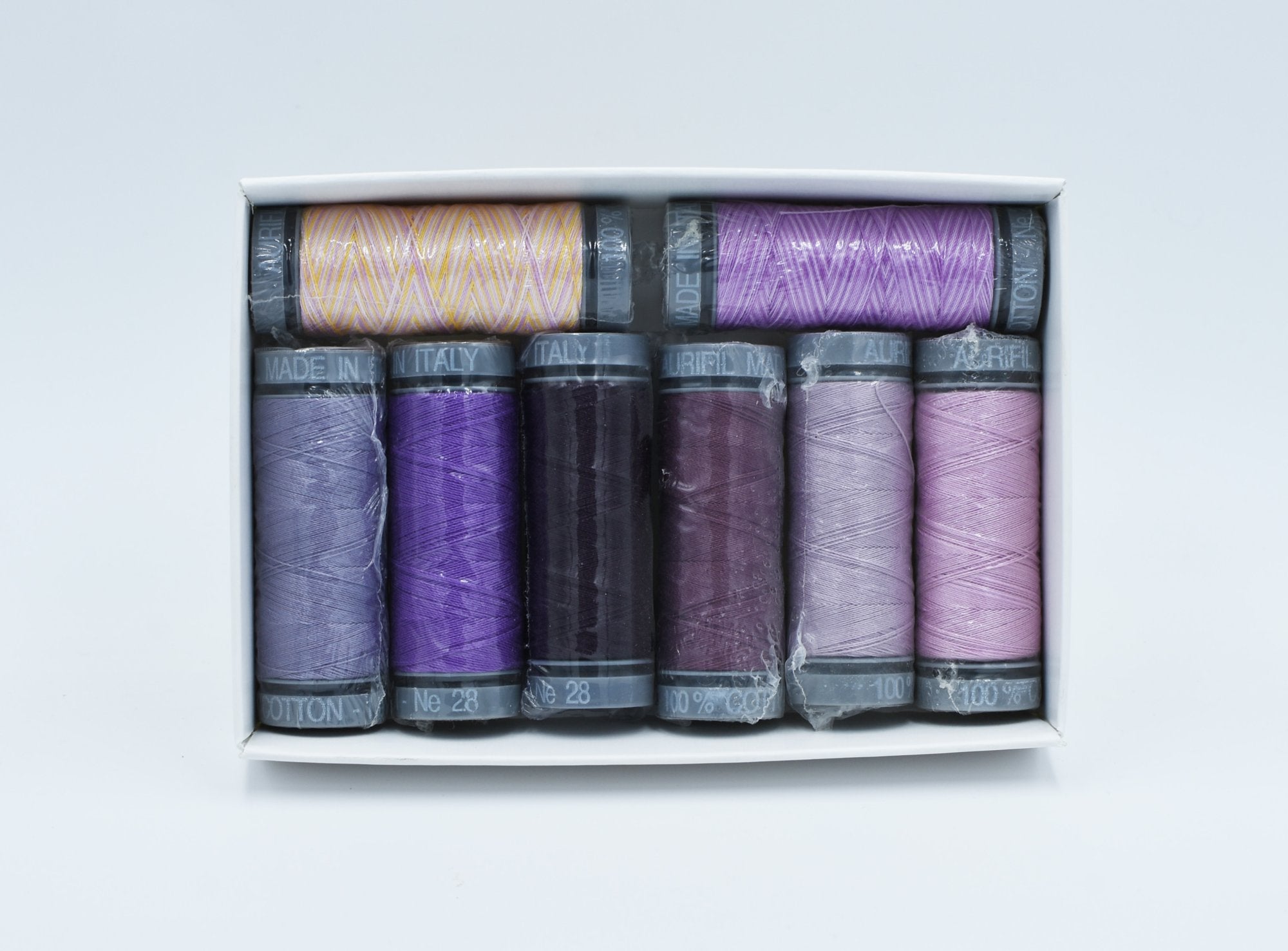 8 x Small Spools (100m) of Aurifil 28wt thread in a cohesive range of purples, packaged in a handy box for easy storage.