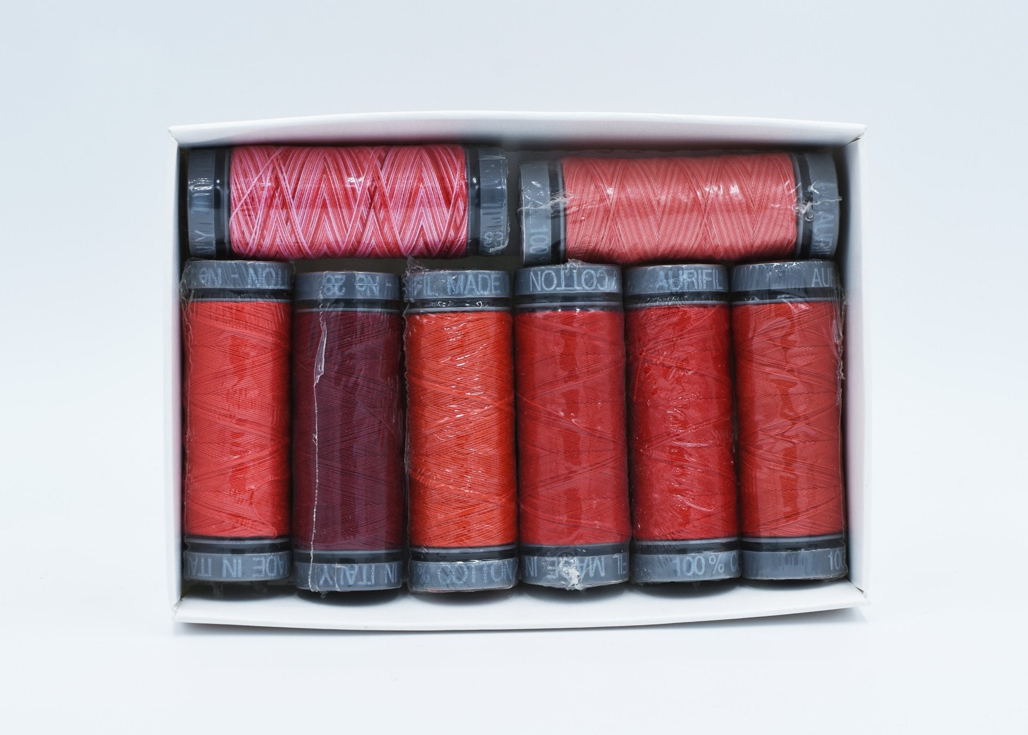8 x Small Spools (100m) of Aurifil 28wt thread in a cohesive range of reds, packaged in a handy box for easy storage.