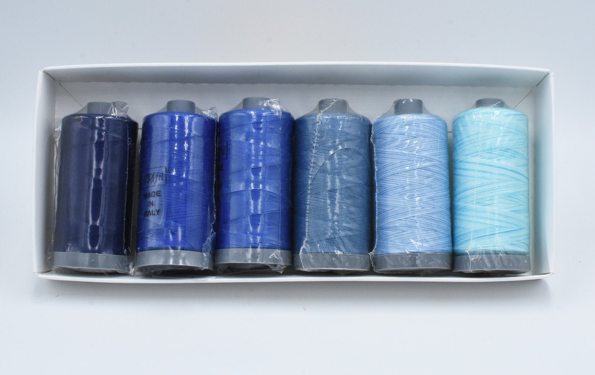 6 x Large Spools (750m) of Aurifil 28wt thread in a cohesive range, packaged in a handy box for easy storage.