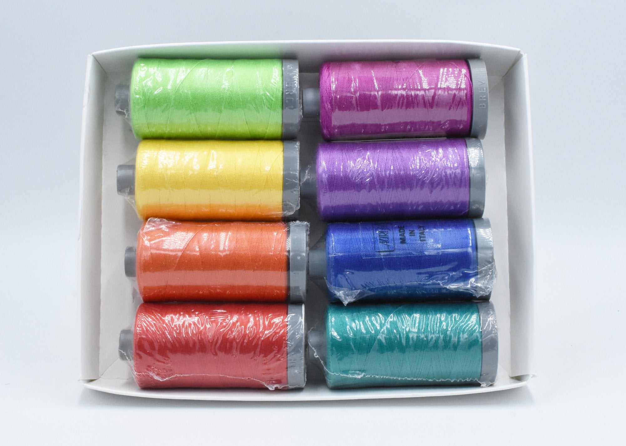 8 x Large Spools (750m) of Aurifil 28wt thread in a cohesive range, packaged in a handy box for easy storage.