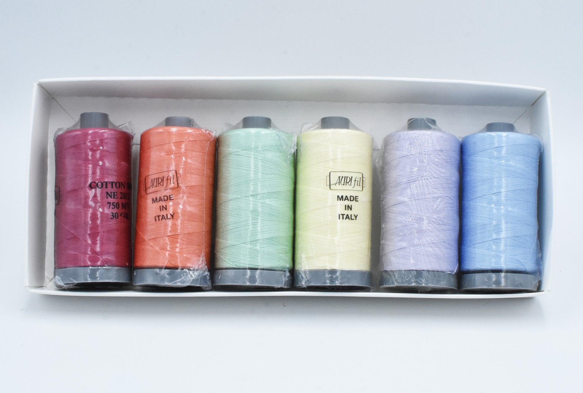 6 x Large Spools (750m) of Aurifil 28wt thread in a cohesive range, packaged in a handy box for easy storage.