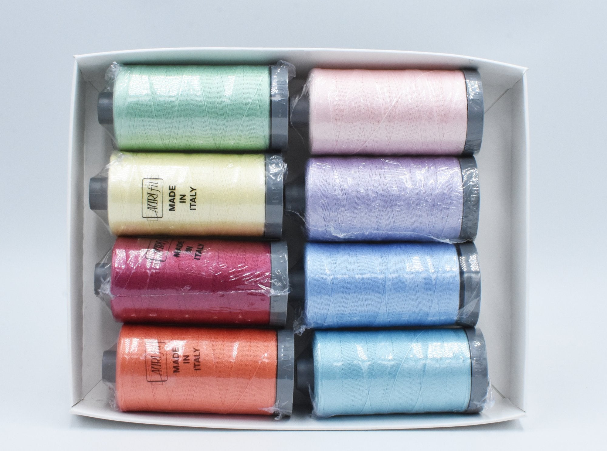 8 x Large Spools (750m) of Aurifil 28wt thread in a cohesive range, packaged in a handy box for easy storage.