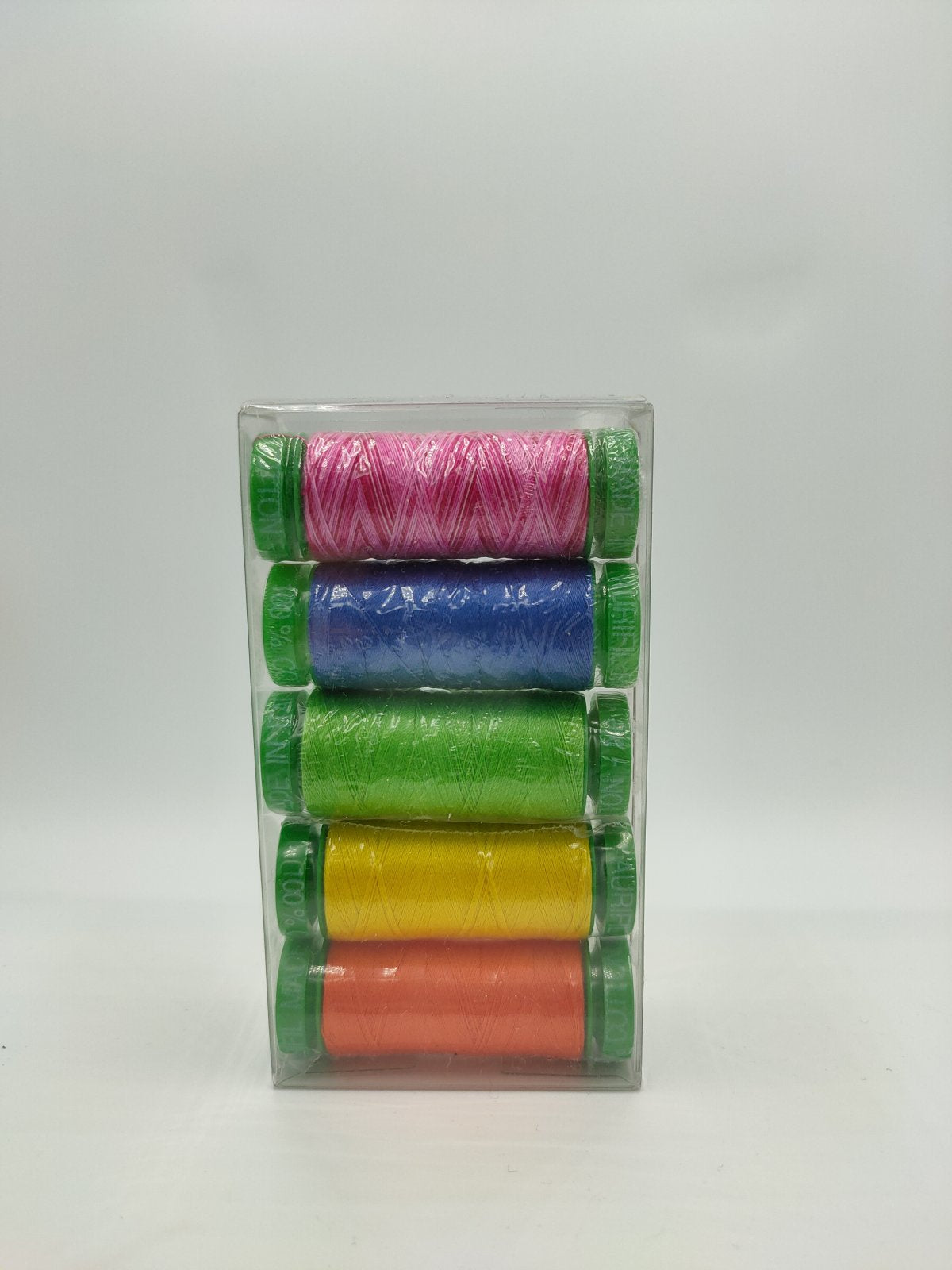 5 x Small Spools (150m) of Aurifil 40wt thread in a cohesive range of variegated brights, packaged in a handy box for easy storage.