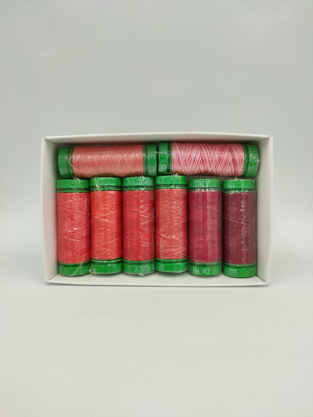 8 x Small Spools (150m) of Aurifil 40wt thread in a cohesive range of reds, packaged in a handy box for easy storage.