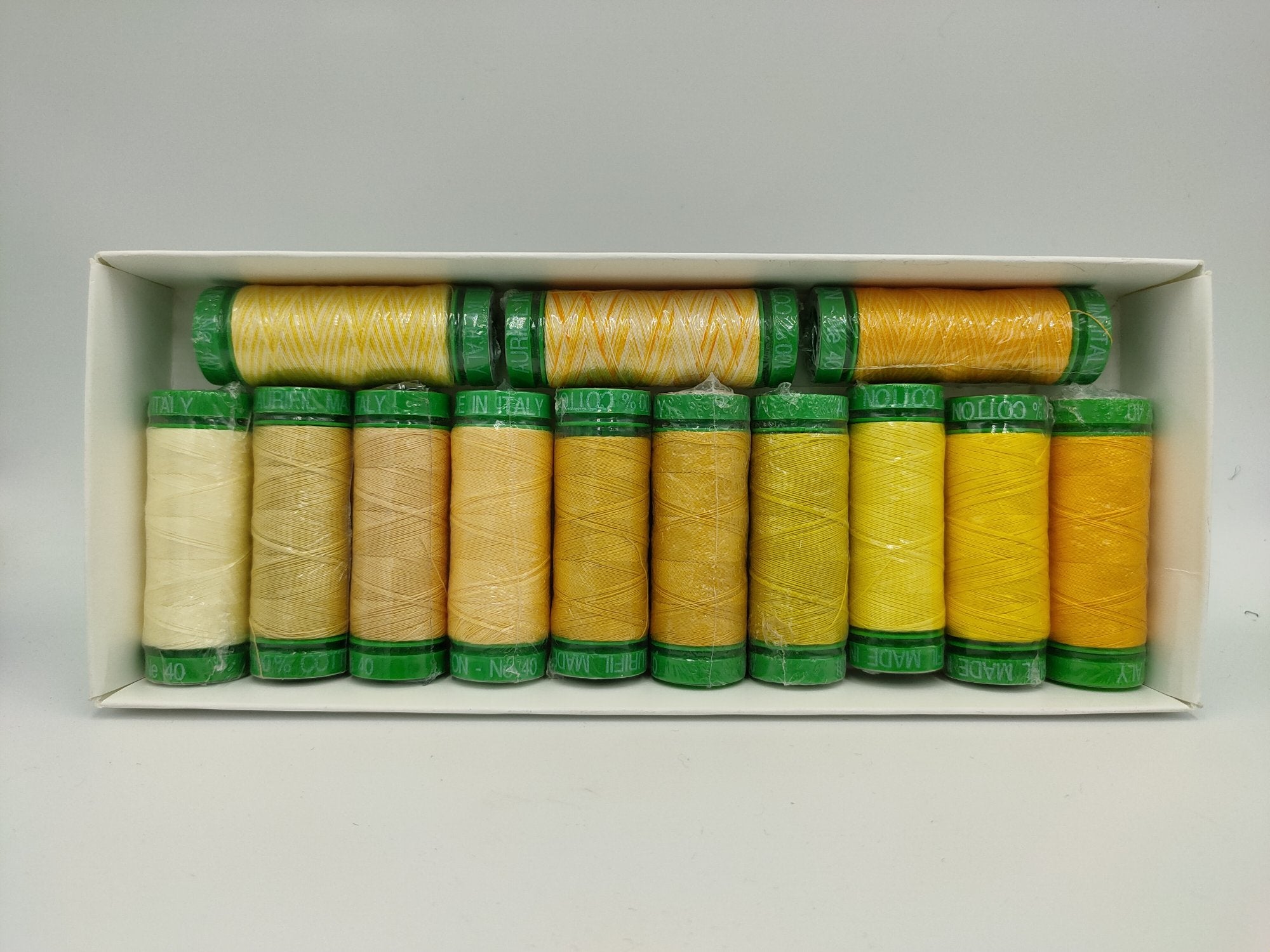 13 x Small Spools (150m) of Aurifil 40wt thread in a cohesive range of yellows, packaged in a handy box for easy storage.