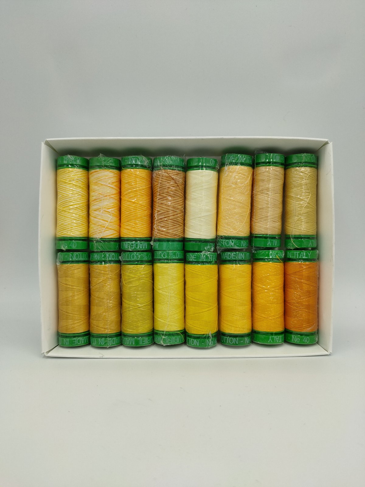 16 x Small Spools (150m) of Aurifil 40wt thread in a cohesive range of yellows, packaged in a handy box for easy storage.