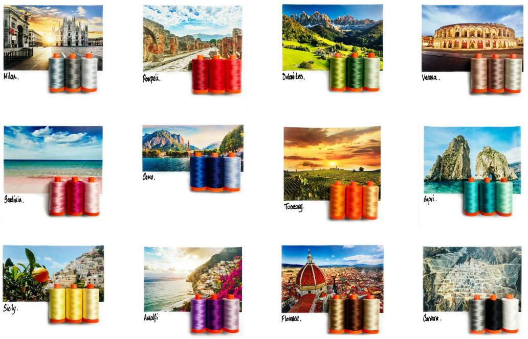 A full set of the 12 Italy 50wt Color Builder collections. The Aurifil Italy Color Builders are capsule of twelve curated mini-collections inspired by (and named after) Italy’s most vibrant and colorful destinations. Each collection contains three large spools of 50wt thread — a warm, a medium, and a dark — within the location’s primary color palette.