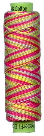 Sue Spargo's Eleganza Perle cotton collection is designed to meet the specific needs of hand stitchers, embroiderers and embellishers. Passionate about stitching, Sue set out to design a product of utmost quality in collaboration with Wonderfil Specialty Threads. Eleganza is made from 100% Giza 88, the highest calibre extra long staple Egyptian cotton. Fibers spun with this fiber create a thread of extreme softness, strength and luster. An extra 15% twist has been incorporated into the design of Eleganza resulting in a thread of superior stability, uniformity and sewability. Eleganza is double gassed and mercerized to eliminate build up of lint and snub, largely enriching the appeal of stitchery. Sue has designed a bright, saturated color palette along with a unique line of variegates. Eleganza's collection of variegates contain extra short variegations in order to provide rapid color change on small scale designs.